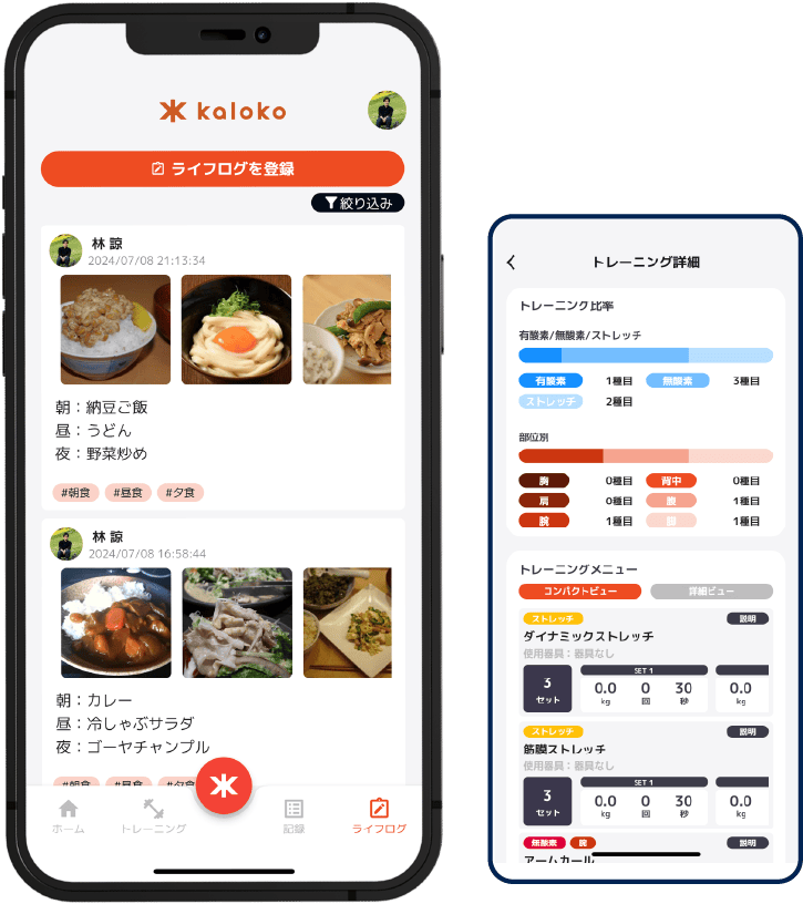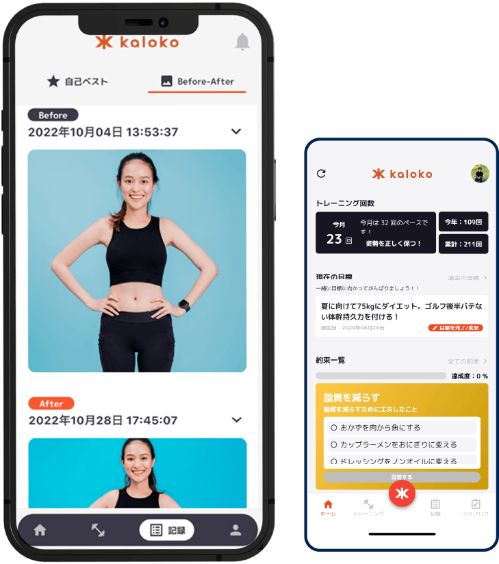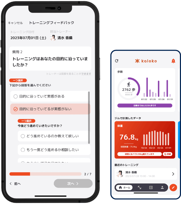 スマホと連携した電子カルテアプリ(kaloko)を導入。一人のトレーナーが一人のお客様を見る(属人化)のではなく、BRLabがワンチームとなり全トレーナーでお客様一人ひとりの健康状態、トレーニング状況をリアルタイムに考え、ディスカッションし、一回のセッションの質を高めていきます。